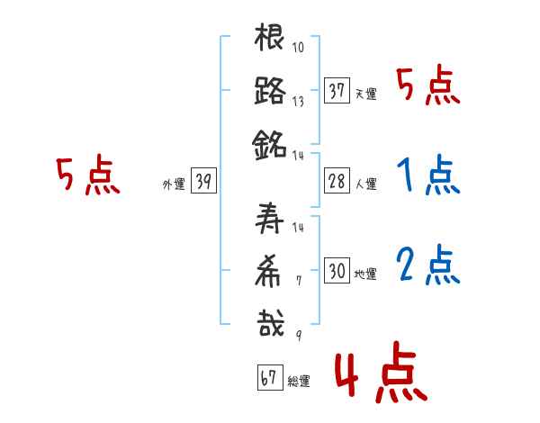 外運![]() | 根路銘寿希哉さんの外運は39画の5つ星!社交性に優れ人望が厚い。人の上に立ち成功する。 生活面を象徴する運勢です。外部から受ける影響力を表し、結婚運、家庭運や職場、環境への順応性を表します。 |
