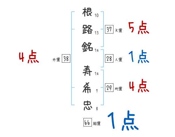 根路銘寿希忠さんの画数の鑑定結果