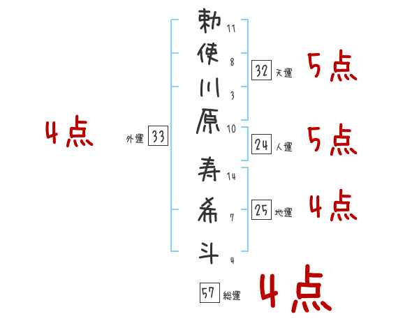 天運![]() | 勅使川原寿希斗さんの天運は32画の5つ星!柔軟性があり成功する。チャンスが多く金運が良い。 家系が持つ宿命的な運勢を表します。祖先から受け継いだ苗字ですので自分の力が及びません。家柄を象徴します。 |