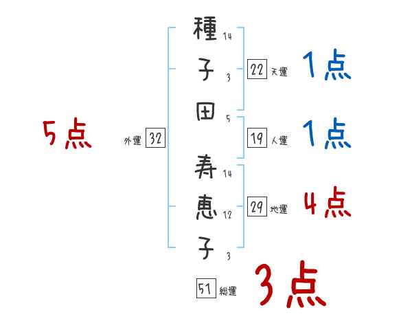 外運![]() | 種子田寿恵子さんの外運は32画の5つ星!柔軟性があり成功する。チャンスが多く金運が良い。 生活面を象徴する運勢です。外部から受ける影響力を表し、結婚運、家庭運や職場、環境への順応性を表します。 |
