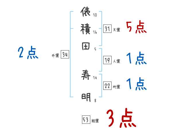 外運![]() | 俵積田寿明さんの外運は34画の2つ星!独創性に優れるが、自尊心が強く災難に注意しましょう。 生活面を象徴する運勢です。外部から受ける影響力を表し、結婚運、家庭運や職場、環境への順応性を表します。 |