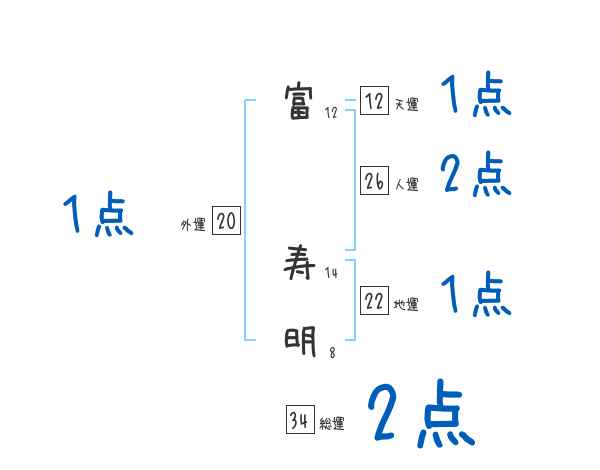 総運![]() | 富寿明さんの総運は34画の2つ星!独創性に優れるが、自尊心が強く災難に注意しましょう。 あなたの人生を表す1番重要な運勢です。生涯を通じて影響する総合運となり、主に50歳以降の晩年期に影響を及ぼします。 |