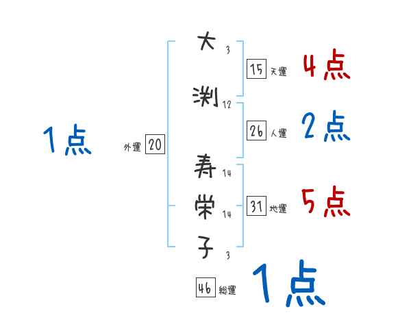 総運![]() | 大渕寿栄子さんの総運は46画の1つ星!迷走することが多く苦労するかも。目先のことにとらわれないように。 あなたの人生を表す1番重要な運勢です。生涯を通じて影響する総合運となり、主に50歳以降の晩年期に影響を及ぼします。 |