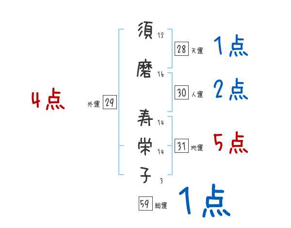 天運![]() | 須磨寿栄子さんの天運は28画の1つ星!家庭環境に注意。スポーツで活躍できる能力があるかも。 家系が持つ宿命的な運勢を表します。祖先から受け継いだ苗字ですので自分の力が及びません。家柄を象徴します。 |