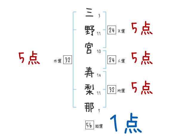 外運![]() | 三野宮寿梨那さんの外運は32画の5つ星!柔軟性があり成功する。チャンスが多く金運が良い。 生活面を象徴する運勢です。外部から受ける影響力を表し、結婚運、家庭運や職場、環境への順応性を表します。 |