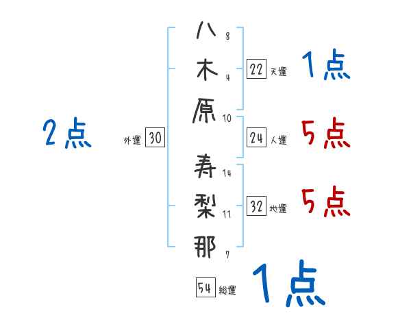 総運![]() | 八木原寿梨那さんの総運は54画の1つ星!トラブルが多いかも。周りをよく見て協調して過ごしましょう。 あなたの人生を表す1番重要な運勢です。生涯を通じて影響する総合運となり、主に50歳以降の晩年期に影響を及ぼします。 |
