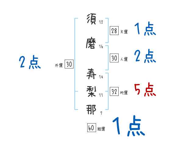 天運![]() | 須磨寿梨那さんの天運は28画の1つ星!家庭環境に注意。スポーツで活躍できる能力があるかも。 家系が持つ宿命的な運勢を表します。祖先から受け継いだ苗字ですので自分の力が及びません。家柄を象徴します。 |