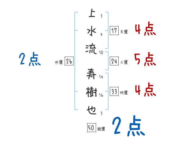 外運![]() | 上水流寿樹也さんの外運は26画の2つ星!波瀾万丈かも。信頼できる人を大事にしましょう。 生活面を象徴する運勢です。外部から受ける影響力を表し、結婚運、家庭運や職場、環境への順応性を表します。 |