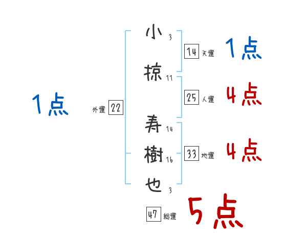 天運![]() | 小掠寿樹也さんの天運は14画の1つ星!人に対して優しいがストレスを溜め込みがち。人間関係のトラブルを避けるよう気をつけましょう。 家系が持つ宿命的な運勢を表します。祖先から受け継いだ苗字ですので自分の力が及びません。家柄を象徴します。 |