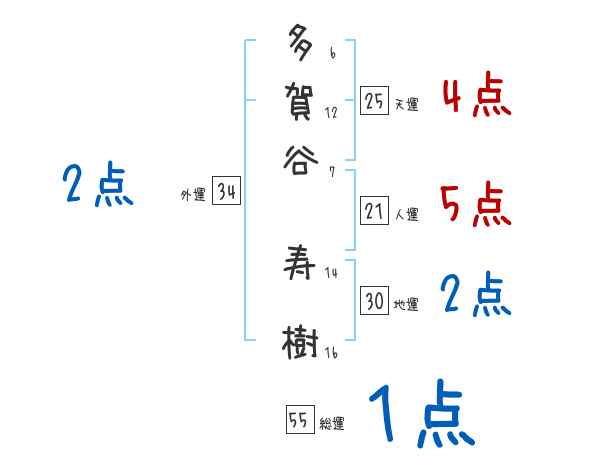 天運![]() | 多賀谷寿樹さんの天運は25画の4つ星!個性があり才能があふれる。強運の持ち主で発展する。 家系が持つ宿命的な運勢を表します。祖先から受け継いだ苗字ですので自分の力が及びません。家柄を象徴します。 |