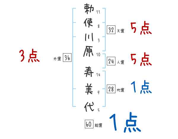 天運![]() | 勅使川原寿美代さんの天運は32画の5つ星!柔軟性があり成功する。チャンスが多く金運が良い。 家系が持つ宿命的な運勢を表します。祖先から受け継いだ苗字ですので自分の力が及びません。家柄を象徴します。 |