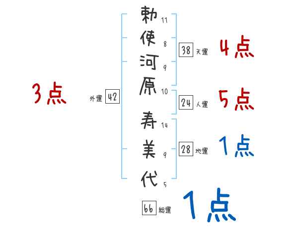 人運![]() | 勅使河原寿美代さんの人運は24画の5つ星!家庭運が良く順調な人生。金運にも恵まれる。 性格や才能などを表す2番目に重要な運勢です。人間関係や協調性、社会的な成功に影響します。主に20歳から50歳ぐらいまでの中年期の運勢を表します。 |
