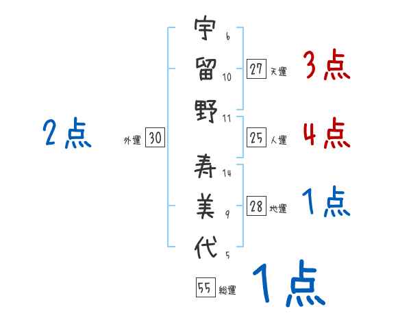 天運![]() | 宇留野寿美代さんの天運は27画の3つ星!頭脳明晰だが強情で摩擦が多い傾向。孤立に注意。 家系が持つ宿命的な運勢を表します。祖先から受け継いだ苗字ですので自分の力が及びません。家柄を象徴します。 |