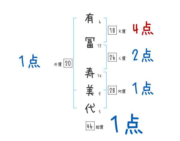 天運![]() | 有冨寿美代さんの天運は18画の4つ星!情熱的で剛気。忍耐力があり信頼される。 家系が持つ宿命的な運勢を表します。祖先から受け継いだ苗字ですので自分の力が及びません。家柄を象徴します。 |