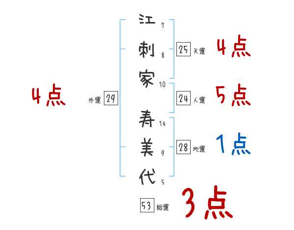総運![]() | 江刺家寿美代さんの総運は53画の3つ星!やや見栄っ張りで虚栄心がある。散財に注意。 あなたの人生を表す1番重要な運勢です。生涯を通じて影響する総合運となり、主に50歳以降の晩年期に影響を及ぼします。 |