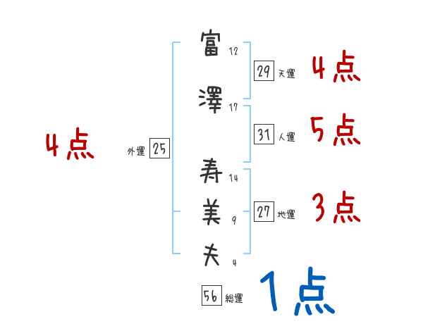 天運![]() | 富澤寿美夫さんの天運は29画の4つ星!完全主義で才能がある。厳格な心の持ち主。 家系が持つ宿命的な運勢を表します。祖先から受け継いだ苗字ですので自分の力が及びません。家柄を象徴します。 |
