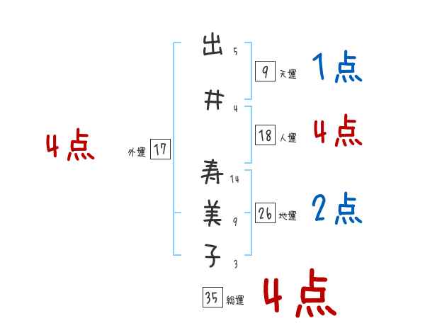 外運![]() | 出井寿美子さんの外運は17画の4つ星!積極的な行動力。地位を気づき財産を手に入れる。純粋な心と直感力。 生活面を象徴する運勢です。外部から受ける影響力を表し、結婚運、家庭運や職場、環境への順応性を表します。 |