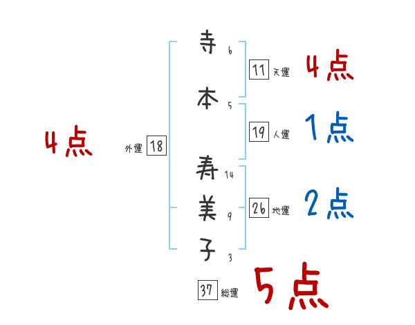 天運![]() | 寺本寿美子さんの天運は11画の4つ星!着実に富や地位を得る幸運な人生。 家系が持つ宿命的な運勢を表します。祖先から受け継いだ苗字ですので自分の力が及びません。家柄を象徴します。 |