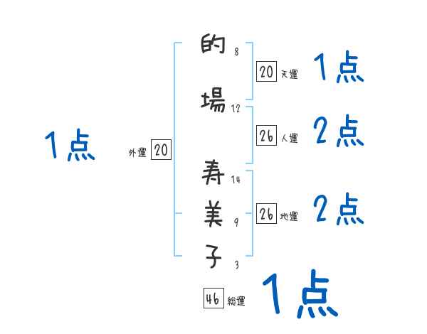 総運![]() | 的場寿美子さんの総運は46画の1つ星!迷走することが多く苦労するかも。目先のことにとらわれないように。 あなたの人生を表す1番重要な運勢です。生涯を通じて影響する総合運となり、主に50歳以降の晩年期に影響を及ぼします。 |