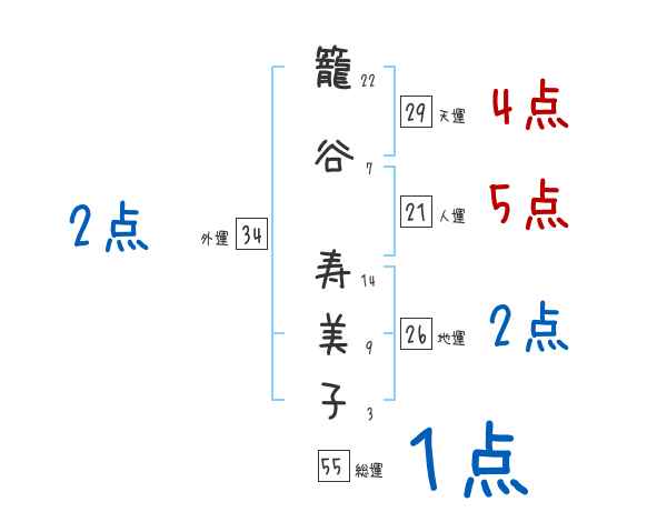 総運![]() | 籠谷寿美子さんの総運は55画の1つ星!欲張りな性格で軽率な行動に注意しましょう。病気に気をつけて。 あなたの人生を表す1番重要な運勢です。生涯を通じて影響する総合運となり、主に50歳以降の晩年期に影響を及ぼします。 |