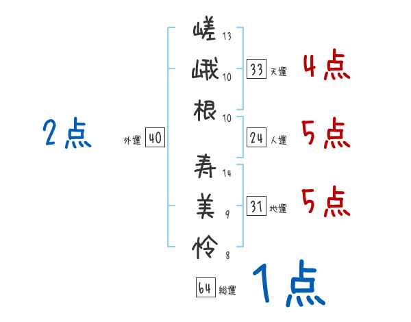 天運![]() | 嵯峨根寿美怜さんの天運は33画の4つ星!権力志向でプライドが高い。勇気があり運を切り開き成功する。 家系が持つ宿命的な運勢を表します。祖先から受け継いだ苗字ですので自分の力が及びません。家柄を象徴します。 |