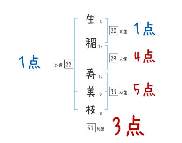 外運![]() | 生稲寿美枝さんの外運は22画の1つ星!努力することが苦手ないっぽう手先が器用。芸術性にも優れる。 生活面を象徴する運勢です。外部から受ける影響力を表し、結婚運、家庭運や職場、環境への順応性を表します。 |
