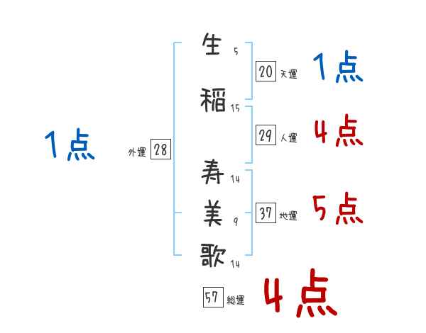 外運![]() | 生稲寿美歌さんの外運は28画の1つ星!家庭環境に注意。スポーツで活躍できる能力があるかも。 生活面を象徴する運勢です。外部から受ける影響力を表し、結婚運、家庭運や職場、環境への順応性を表します。 |