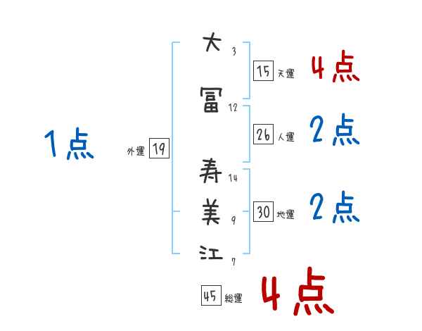 外運![]() | 大冨寿美江さんの外運は19画の1つ星!優れた才能を持ちますが、協調性が足りないことも。周りの人と協力する事を意識しましょう。 生活面を象徴する運勢です。外部から受ける影響力を表し、結婚運、家庭運や職場、環境への順応性を表します。 |