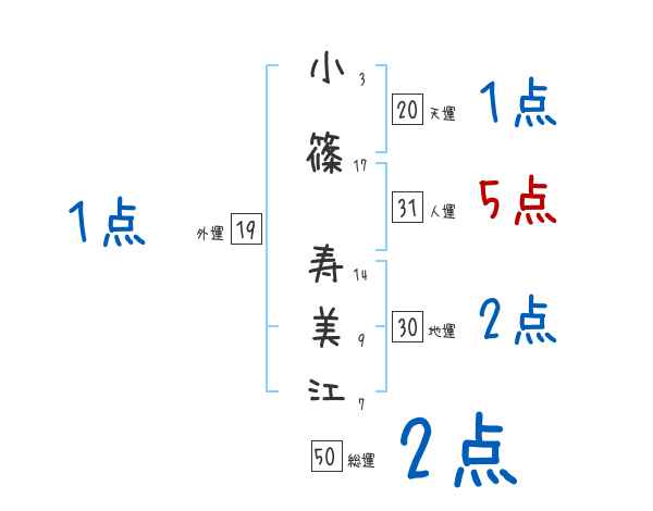 外運![]() | 小篠寿美江さんの外運は19画の1つ星!優れた才能を持ちますが、協調性が足りないことも。周りの人と協力する事を意識しましょう。 生活面を象徴する運勢です。外部から受ける影響力を表し、結婚運、家庭運や職場、環境への順応性を表します。 |