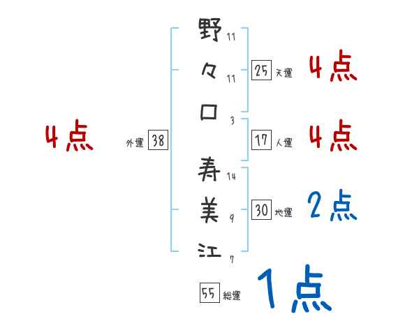 天運![]() | 野々口寿美江さんの天運は25画の4つ星!個性があり才能があふれる。強運の持ち主で発展する。 家系が持つ宿命的な運勢を表します。祖先から受け継いだ苗字ですので自分の力が及びません。家柄を象徴します。 |