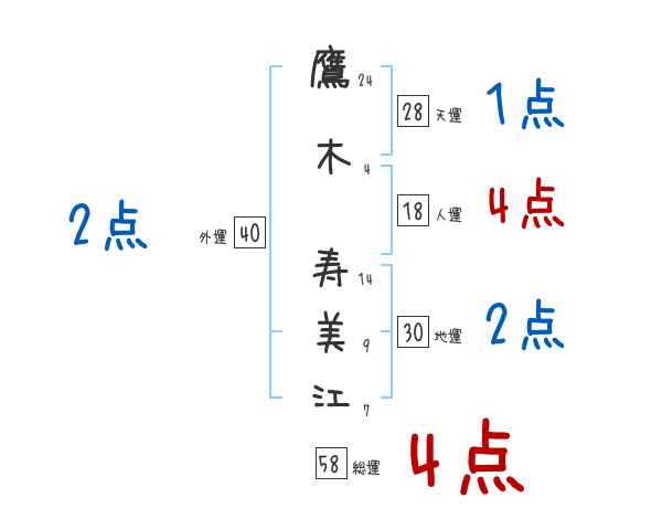 天運![]() | 鷹木寿美江さんの天運は28画の1つ星!家庭環境に注意。スポーツで活躍できる能力があるかも。 家系が持つ宿命的な運勢を表します。祖先から受け継いだ苗字ですので自分の力が及びません。家柄を象徴します。 |