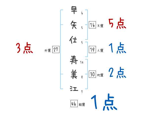 天運![]() | 早矢仕寿美江さんの天運は16画の5つ星!人望が厚く大きく発展する。逆転成功が見える。 家系が持つ宿命的な運勢を表します。祖先から受け継いだ苗字ですので自分の力が及びません。家柄を象徴します。 |