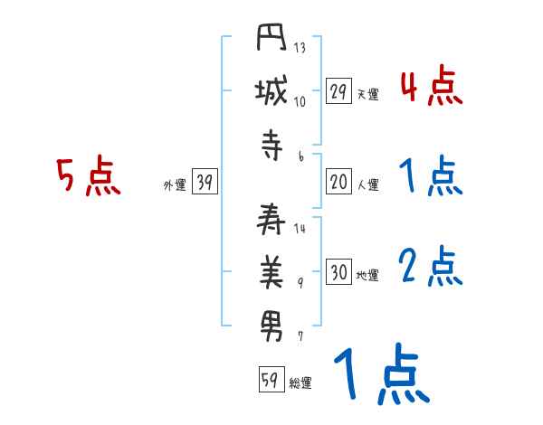 外運![]() | 円城寺寿美男さんの外運は39画の5つ星!社交性に優れ人望が厚い。人の上に立ち成功する。 生活面を象徴する運勢です。外部から受ける影響力を表し、結婚運、家庭運や職場、環境への順応性を表します。 |