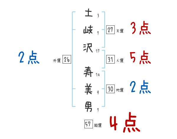 総運![]() | 土岐沢寿美男さんの総運は57画の4つ星!向上心があり人望がある。地位を得る。 あなたの人生を表す1番重要な運勢です。生涯を通じて影響する総合運となり、主に50歳以降の晩年期に影響を及ぼします。 |