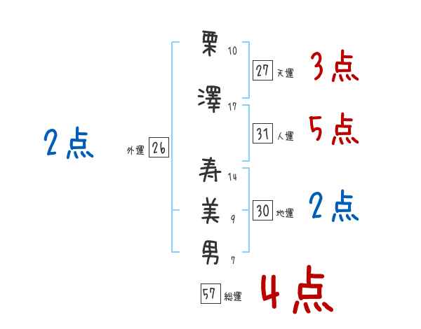 外運![]() | 栗澤寿美男さんの外運は26画の2つ星!波瀾万丈かも。信頼できる人を大事にしましょう。 生活面を象徴する運勢です。外部から受ける影響力を表し、結婚運、家庭運や職場、環境への順応性を表します。 |