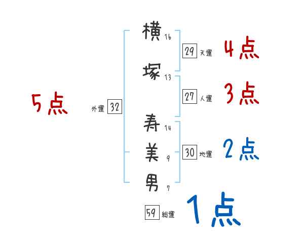 外運![]() | 横塚寿美男さんの外運は32画の5つ星!柔軟性があり成功する。チャンスが多く金運が良い。 生活面を象徴する運勢です。外部から受ける影響力を表し、結婚運、家庭運や職場、環境への順応性を表します。 |
