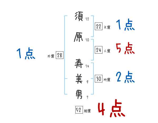 外運![]() | 須原寿美男さんの外運は28画の1つ星!家庭環境に注意。スポーツで活躍できる能力があるかも。 生活面を象徴する運勢です。外部から受ける影響力を表し、結婚運、家庭運や職場、環境への順応性を表します。 |