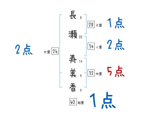 外運![]() | 長瀬寿美香さんの外運は26画の2つ星!波瀾万丈かも。信頼できる人を大事にしましょう。 生活面を象徴する運勢です。外部から受ける影響力を表し、結婚運、家庭運や職場、環境への順応性を表します。 |