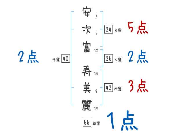 地運![]() | 安次富寿美麗さんの地運は42画の3つ星!病気に注意。多芸であるが消極的でおとなしい。 個性を表す基礎的な運勢です。性格形成や対人関係、行動力など家庭環境に影響されます。主に誕生してから20歳くらいまでの若年期の運勢を表します。 |