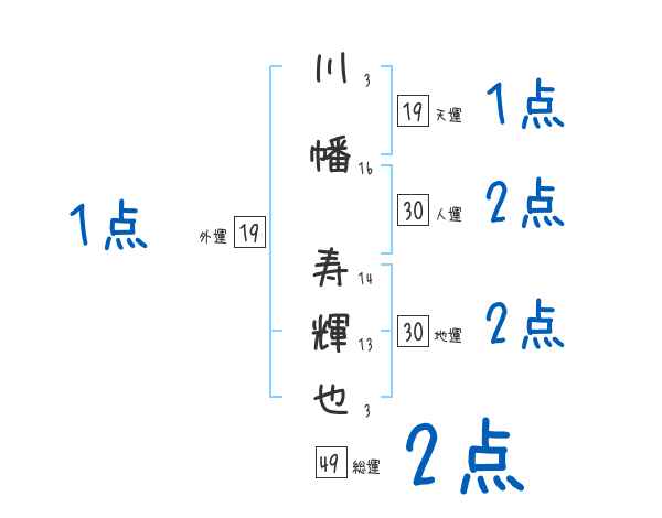 外運![]() | 川幡寿輝也さんの外運は19画の1つ星!優れた才能を持ちますが、協調性が足りないことも。周りの人と協力する事を意識しましょう。 生活面を象徴する運勢です。外部から受ける影響力を表し、結婚運、家庭運や職場、環境への順応性を表します。 |