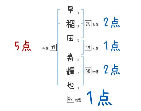 外運![]() | 早稲田寿輝也さんの外運は37画の5つ星!努力家で順応性に優れる。現実的な考え方ができ忠実に物事をこなす。 生活面を象徴する運勢です。外部から受ける影響力を表し、結婚運、家庭運や職場、環境への順応性を表します。 |