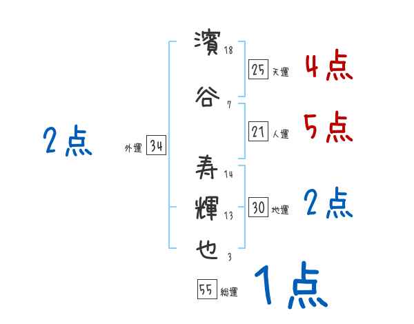| 外運  | 濱谷寿輝也さんの外運は34画の2つ星!独創性に優れるが、自尊心が強く災難に注意しましょう。生活面を象徴する運勢です。外部から受ける影響力を表し、結婚運、家庭運や職場、環境への順応性を表します。 |