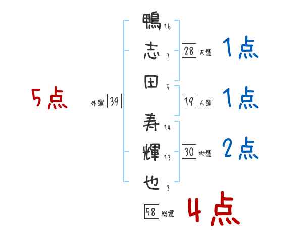 外運![]() | 鴨志田寿輝也さんの外運は39画の5つ星!社交性に優れ人望が厚い。人の上に立ち成功する。 生活面を象徴する運勢です。外部から受ける影響力を表し、結婚運、家庭運や職場、環境への順応性を表します。 |
