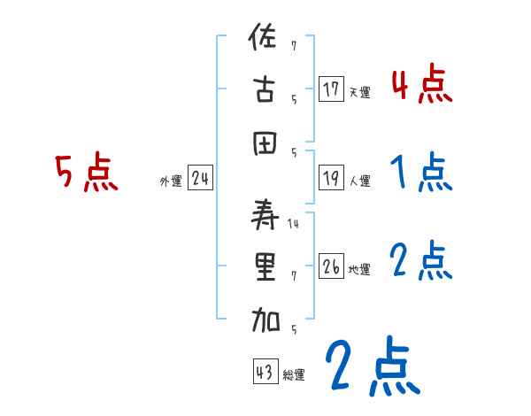 天運![]() | 佐古田寿里加さんの天運は17画の4つ星!積極的な行動力。地位を気づき財産を手に入れる。純粋な心と直感力。 家系が持つ宿命的な運勢を表します。祖先から受け継いだ苗字ですので自分の力が及びません。家柄を象徴します。 |