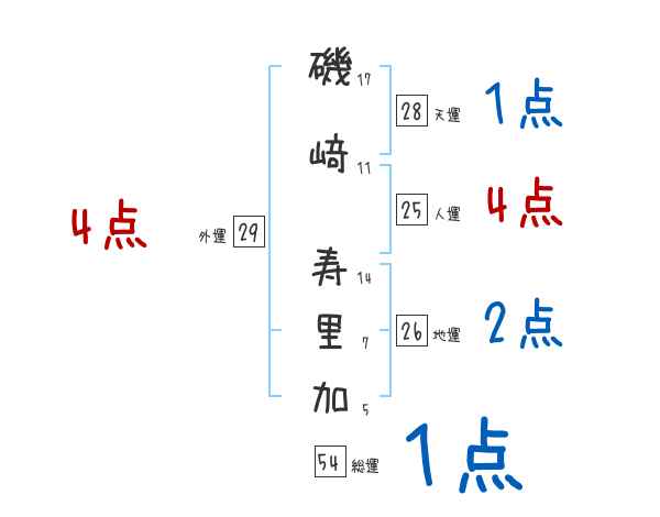 外運![]() | 磯﨑寿里加さんの外運は29画の4つ星!完全主義で才能がある。厳格な心の持ち主。 生活面を象徴する運勢です。外部から受ける影響力を表し、結婚運、家庭運や職場、環境への順応性を表します。 |
