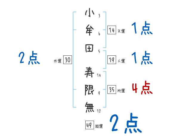 地運![]() | 小牟田寿限無さんの地運は35画の4つ星!温厚な性格で感受性が高い。穏和な性格で人望が厚い。 個性を表す基礎的な運勢です。性格形成や対人関係、行動力など家庭環境に影響されます。主に誕生してから20歳くらいまでの若年期の運勢を表します。 |