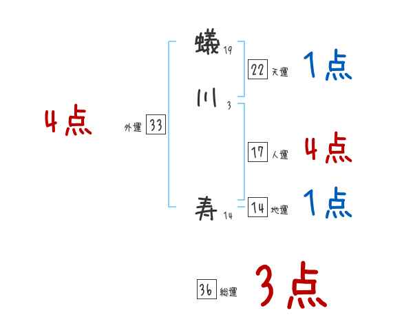 外運![]() | 蟻川寿さんの外運は33画の4つ星!権力志向でプライドが高い。勇気があり運を切り開き成功する。 生活面を象徴する運勢です。外部から受ける影響力を表し、結婚運、家庭運や職場、環境への順応性を表します。 |