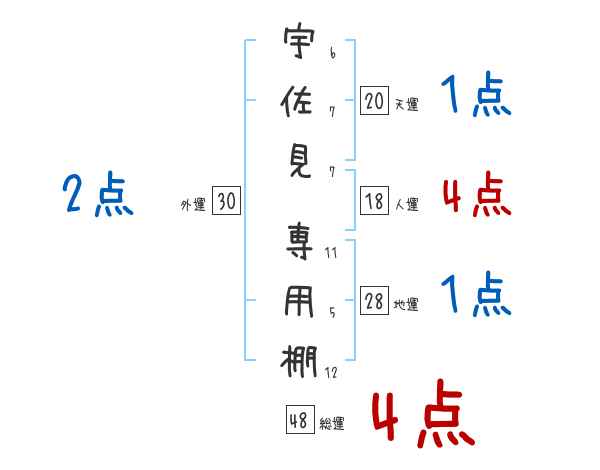 地運![]() | 宇佐見専用棚さんの地運は28画の1つ星!家庭環境に注意。スポーツで活躍できる能力があるかも。 個性を表す基礎的な運勢です。性格形成や対人関係、行動力など家庭環境に影響されます。主に誕生してから20歳くらいまでの若年期の運勢を表します。 |