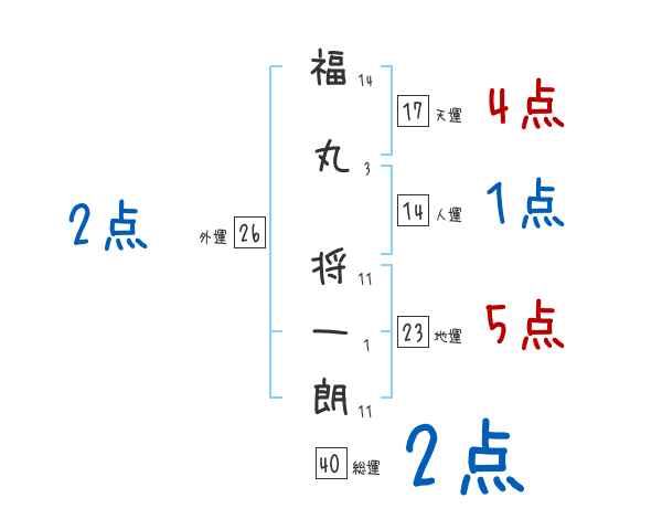 外運![]() | 福丸将一朗さんの外運は26画の2つ星!波瀾万丈かも。信頼できる人を大事にしましょう。 生活面を象徴する運勢です。外部から受ける影響力を表し、結婚運、家庭運や職場、環境への順応性を表します。 |