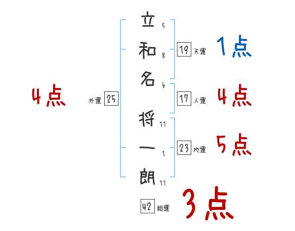 天運![]() | 立和名将一朗さんの天運は19画の1つ星!優れた才能を持ちますが、協調性が足りないことも。周りの人と協力する事を意識しましょう。 家系が持つ宿命的な運勢を表します。祖先から受け継いだ苗字ですので自分の力が及びません。家柄を象徴します。 |